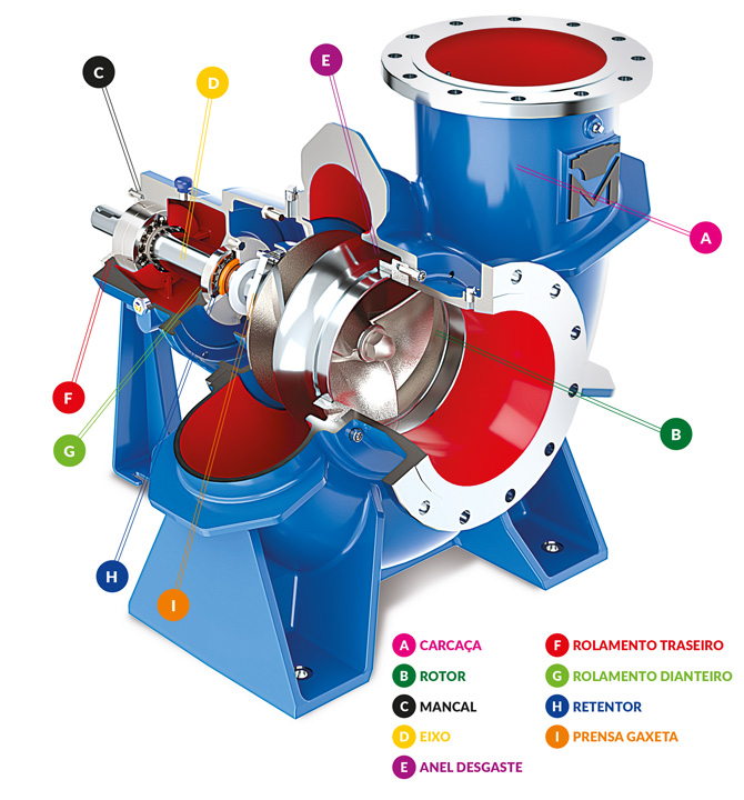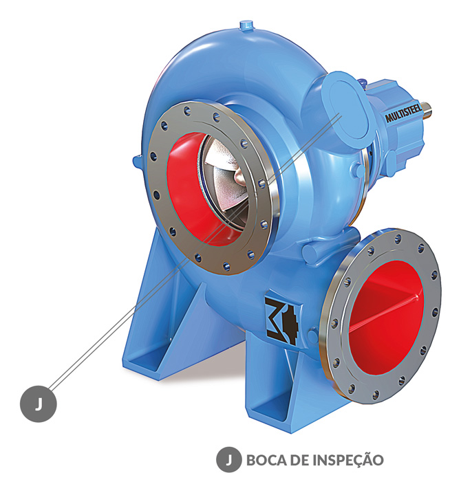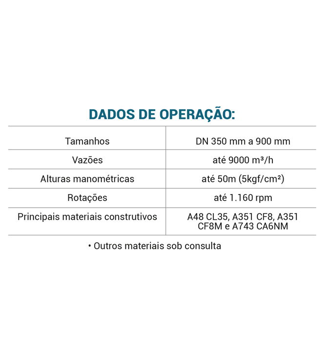 Seu projeto hidráulico permite operar com altas vazões e baixas alturas manométricas, atendendo a diversas necessidades industriais e de saneamento.